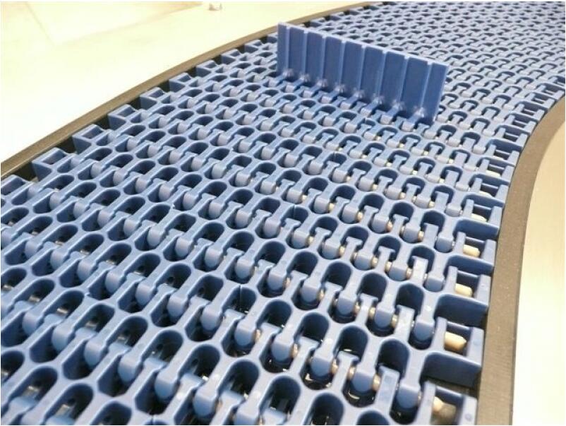 网带输送机:模块式塑料输送带用延伸在输送带整个宽度上的塑料铰接销,把注塑成型的塑料模块组装成互锁单元。这种“砌砖式”方法增加了输送带的强度,每一条输送带都可以根据订制,并可以组接成任何需要的宽度和长度。挡板和侧板也可以用铰接销互锁,成为输送带整体部件之一。